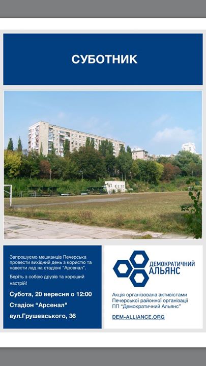 Печерський осередок партії Демократичний Альянс в Києві запрошує всіх приєднатися до суботника на стадіоні Арсенал. Активісти хочуть спільними зусиллями навести лад на Печерську і чекають всіх бажаючих 20 вересня (субота) о 12:00, на вул. Грушевського, 36 (також можна зайти з Кловського узвозу, 5).