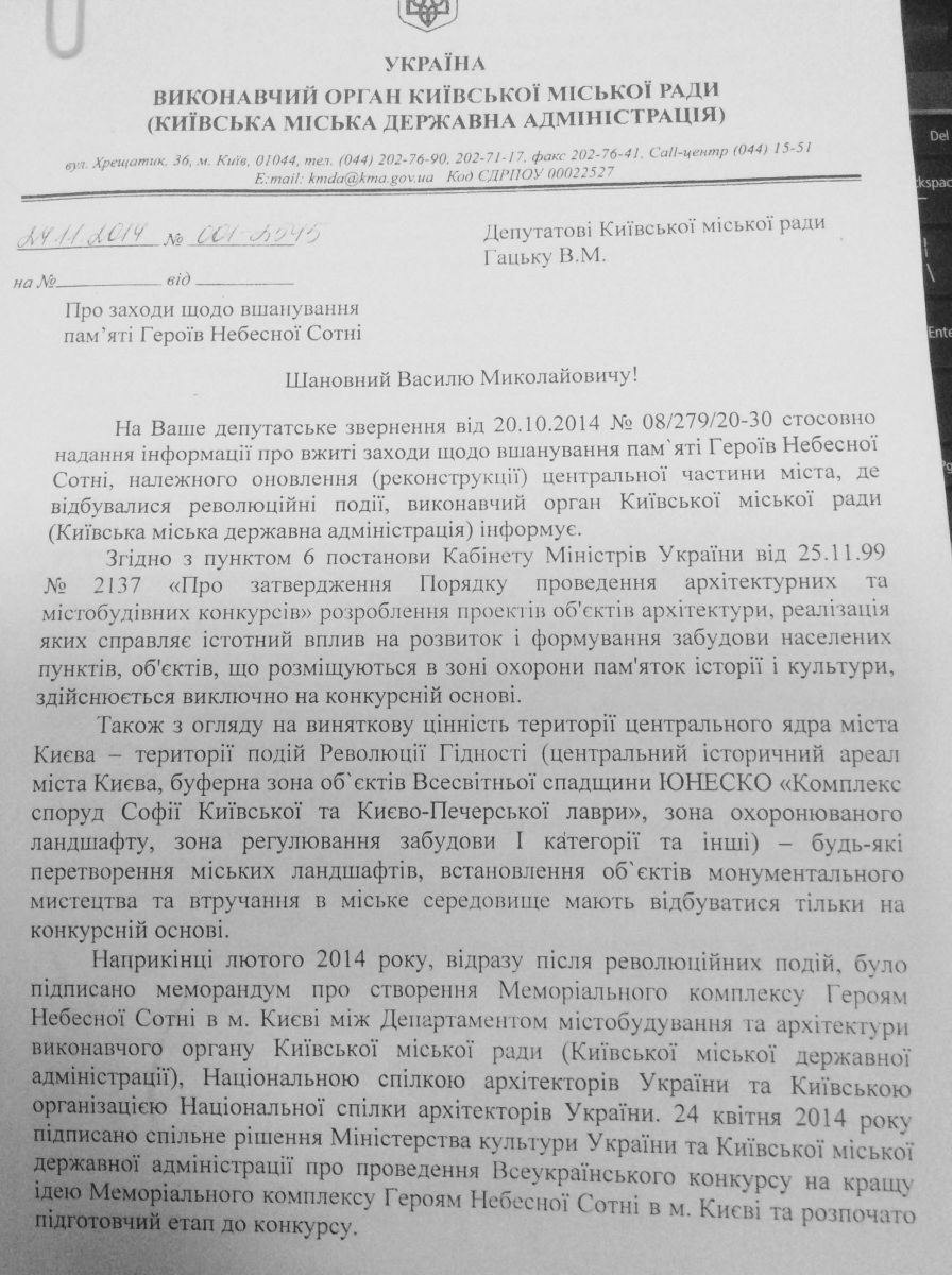 В листопаді 2015 року в Києві буде презентовано проект меморіалу Небесній Сотні. Таку відповідь отримав на депутатський запит – депутат Київради від ДемАльянсу Василь ГАЦЬКО. КМДА повідомляє, що на разі підписано Меморандум про створення Меморіального комплексу Героям Небесної Сотні. На триває Міжнародний відкритий конкурс на оновлення громадського простору центрального ядра міста Києва з меморіалізацією подій Революції Гідності.