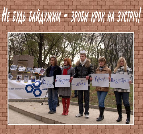 Акція та фотовиставка „Крок на зустріч”, присвячена проблемі байдужого і ворожого ставлення громадян до безпритульних тварин. Захід проходить в рамках Всеукраїнської Школи Молодого Лідера від Демократичного Альянсу „Почни з себе – зміни країну ”.