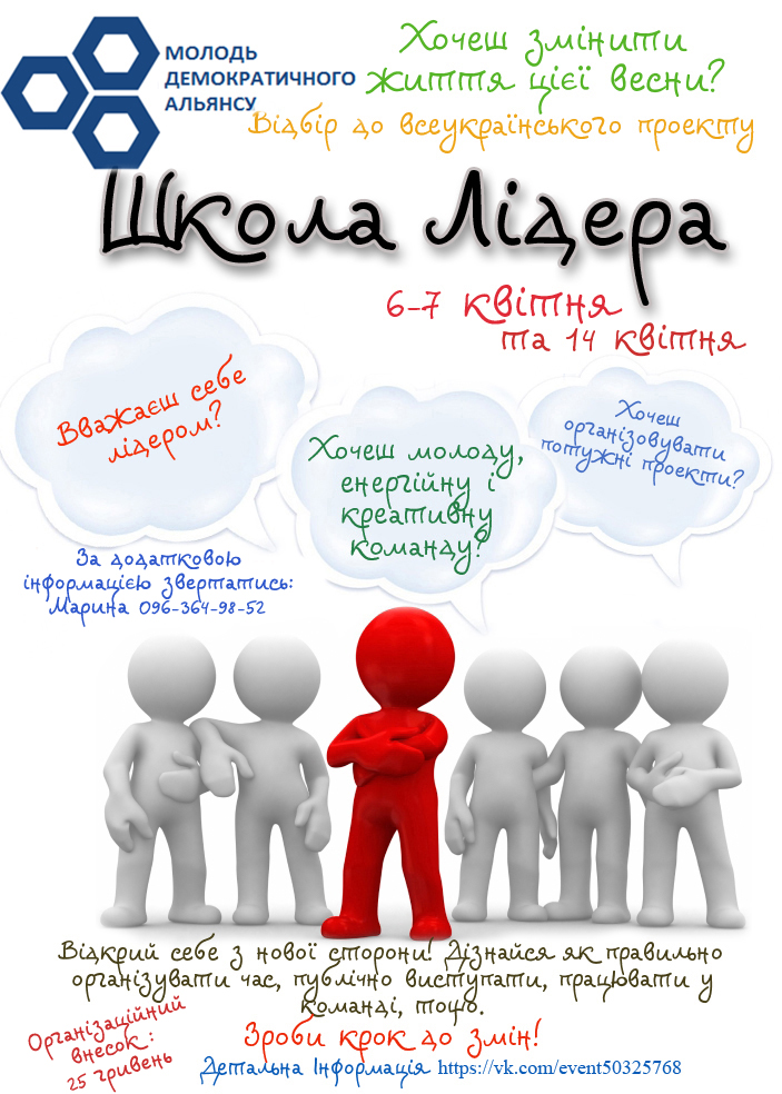 Вінницький осередок Молоді ДемАльянсу пропонує всім допитливим та активним отримати свій квиток у Школу лідера. Для цього потрібно заповнити онлайн-анкету. Школа триватиме 3 дні (6-7.04.2013 та 14.04.2013)