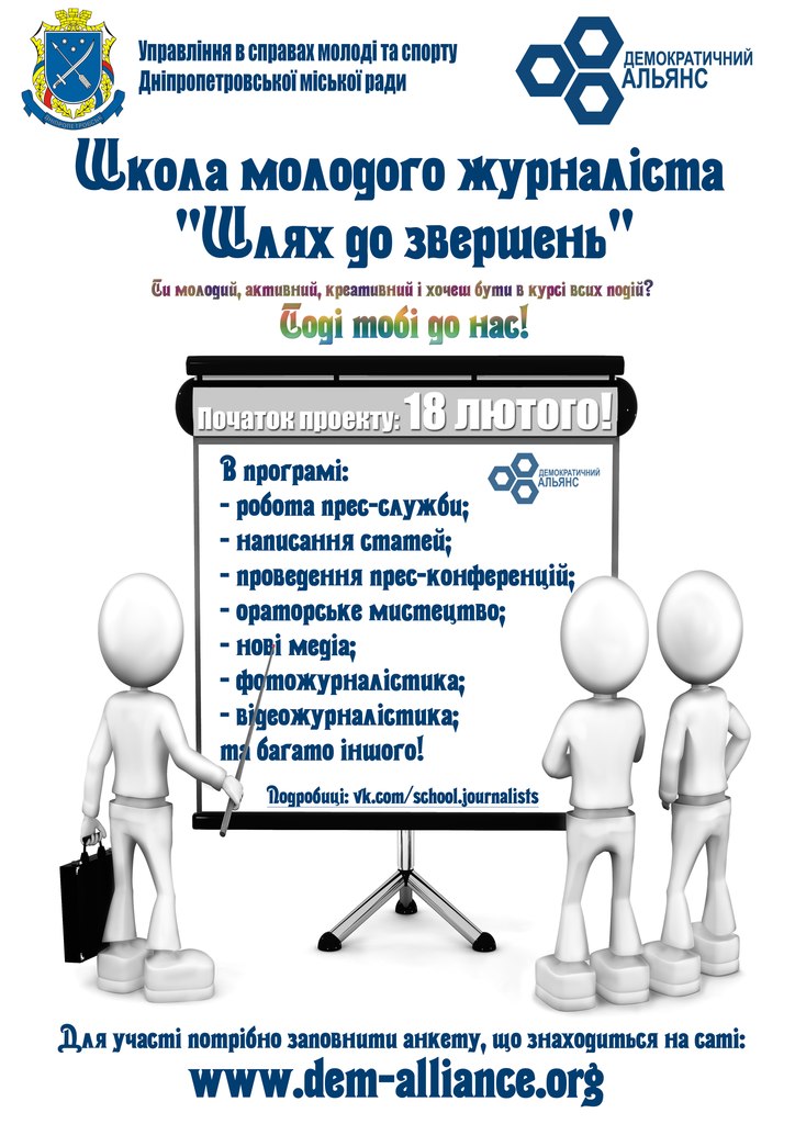 Дніпропетровський обласний осередок Молоді Демократичного Альянсу» разом з управлінням у справах молоді та спорту Дніпропетровської міської ради розпочинає набір учасників проекту «Школа молодого журналіста «Шлях до звершень!».
